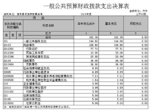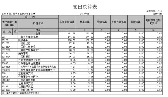 本部门2019年度财政拨款本年支出年初预算数为162.84 万元,决算数为162.39万元,完成年初预算的 99 %。其中: