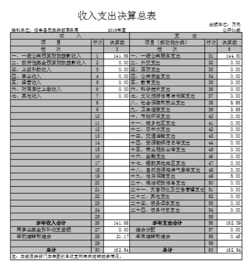 本部门2019年度收入总计162.84万元,其中年初结转和结余 21.17 万元,较2018年(减少)27.57 万元,(下降)17 %;本年收入合计 141.68 万元,较2018年增加9.5万元,增长6 %,主要原因是:结余比2017年少。