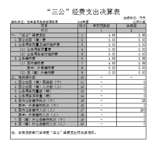 (二)公务接待费支出年初预算数为4.65万元,决算数为 2.58万元,完成预算的60 %,决算数较2018年(减少)1.73万元,(下降)40 %。决算数较年初预算数(减少)的主要原因是:减少支出。