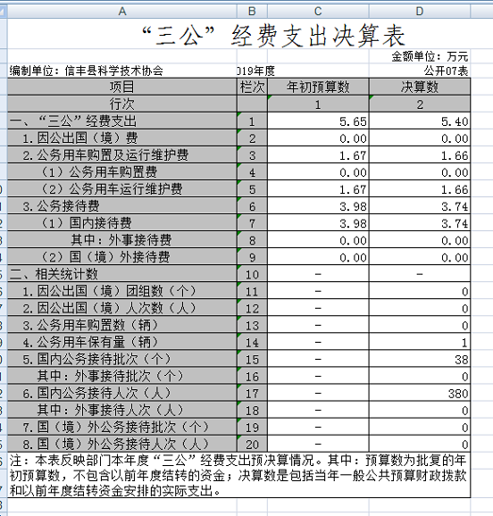 (二)公务接待费支出年初预算数为3.9万元,决算数为3.7万元,完成预算的54 %,决算数较2018年增加0.7万元,增长14%。决算数较年初预算数增加的主要原因是科普培训增加,聘请授课专家多,故接待费增加。
