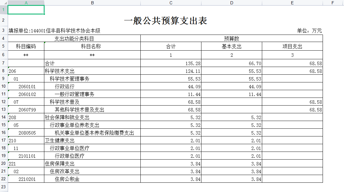 本部门一般公共预算支出功能分类科目,206科学技术支出反映科学技术方面的支出,20601科学技术管理事务反映各级政府科学技术管理事务方面的支出,2060101行政运行反映行政单位的基本支出,2060799 其他科学技术普及支出反映除上述项目以外其他用于科学技术普及方面的支出,2069999其他科学技术支出反映除以上各项以外用于科技方面的支出。208社会保障和就业支出反映政府在社会保障和就业的支出,20805行政事业单位离退休反映用于行政事业单位离退休方面的支出,2080501归口管理的行政单位离退休反映实行归口管理的行政单位开支的离退休经费,2080505机关事业单位基本养老保险缴费支出 反映机关事业单位实施基本养老保险制度由单位缴纳的基本养老保险费支出,2080506 机关事业单位职业年金缴费支出反映机关事业单位实施基本养老保险制度由单位缴纳的职业年金支出。221住房保障支出集中反映政府用于住房方面的支出,22102住房改革支出反映行政事业单位用财政拨款资金和其他资金等安排的住房改革支出,2210201住房公积金反映行政事业单位按人力资源和社会保障部、财政部规定的基本工资和津贴补贴以及规定比例为职工缴纳的住房公积金。
