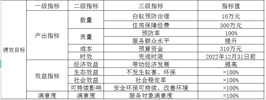 4)实施方案。一是根据我中心实际情况,全面了解中心运行存在的问题,主动对接,加强上下沟通,确保我中心正常运行。二是制定白蚁防治方案,通过绩效控制,项目实施分现场勘查、白蚁预防、科普宣传、项目验收、档案管理等工作事项,从而提高群众满意度,防治措施安全环保,不危及环境。