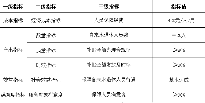 7)绩效目标和指标。绩效目标为提高机关收入,保障自来水公司退休人员生活补贴,按时发放到位。