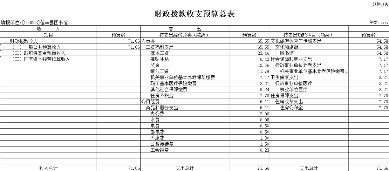 2023年信丰县图书馆财政拨款支出预算71.66万元,较上年预算安排增加1.03万元。具体为:一般公共服务支出54.58万元,社会保障和就业7.17万元,卫生健康支出2.21万元,住房保障支出7.7万元。