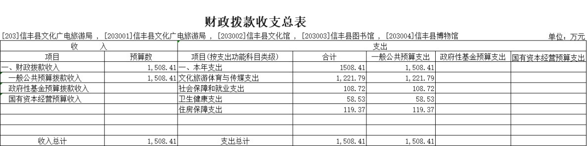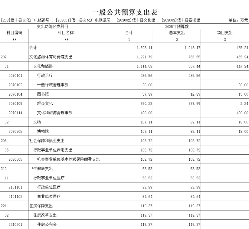2025年文广旅局部门财政拨款支出预算总额 1508.41 万元,较上年预算安排减少 203.52 万元;