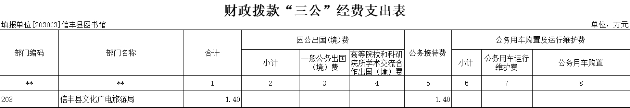 (二)“三公”经费:指用财政拨款安排的因公出国(境)费、公务用车购置及运行维护费和公务接待费。其中,因公出国(境)费反映单位公务出国(境)的国际旅费、国外城市间交通费、住宿费、伙食费、培训费、公杂费等支出;公务用车购置及运行维护费反映单位公务用车车辆购置支出(含车辆购置税、牌照费),按规定保留的公务用车燃料费、维修费、过桥过路费、保险费、安全奖励费用等支出;公务接待费反映单位按规定开支的各类公务接待(含外宾接待)支出。