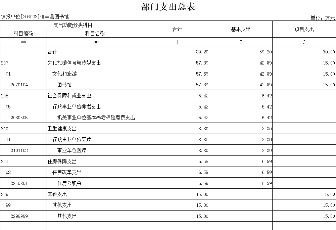 按支出功能科目划分:一般公共服务支出 0 万元,国防支出 0 万元,公共安全支出 0 万元,教育支出 0 万元,科学技术支出 0 万元,文化旅游体育与传媒支出 57.89 万元,社会保障和就业支出 6.42 万元,卫生健康支出 3.3 万元,节能环保支出 0 万元,城乡社区支出 0 万元,农林水支出 0 万元,交通运输支出 0 万元,资源勘探工业信息等支出0 万元,商业服务业等支出 0 万元,金融支出 0 万元,自然资源海洋气象等支出 0 万元,住房保障支出 6.59 万元,粮油物资储备支出 0 万元,灾害防治及应急管理支出0 万元,其他支出 15 万元。