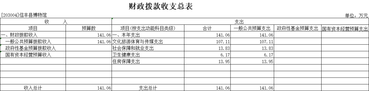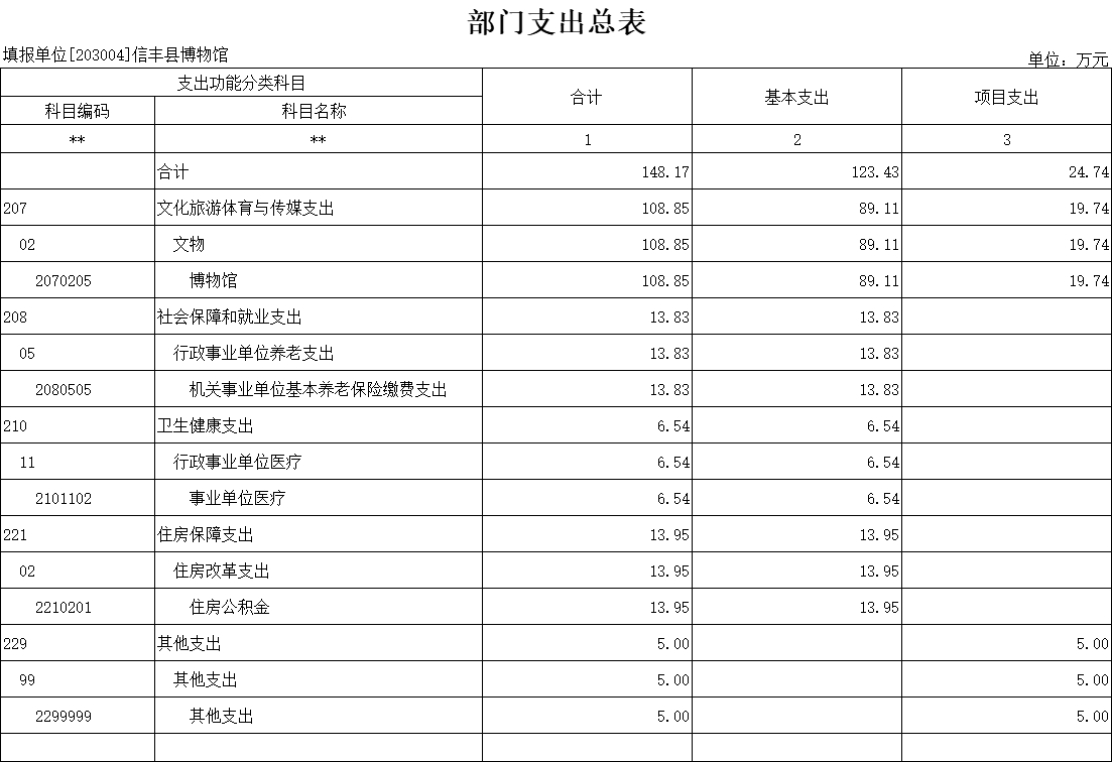 按支出功能科目划分:一般公共服务支出 0 万元,国防支出 0 万元,公共安全支出 0 万元,教育支出 0 万元,科学技术支出 0 万元,文化旅游体育与传媒支出 107.11 万元,社会保障和就业支出 13.83 万元,卫生健康支出 6.17 万元,节能环保支出 0 万元,城乡社区支出 0 万元,农林水支出0 万元,交通运输支出 0 万元,资源勘探工业信息等支出0 万元,商业服务业等支出 0 万元,金融支出 0 万元,自然资源海洋气象等支出 0 万元,住房保障支出 13.95 万元,粮油物资储备支出 0 万元,灾害防治及应急管理支出 0 万元,其他支出 5 万元。