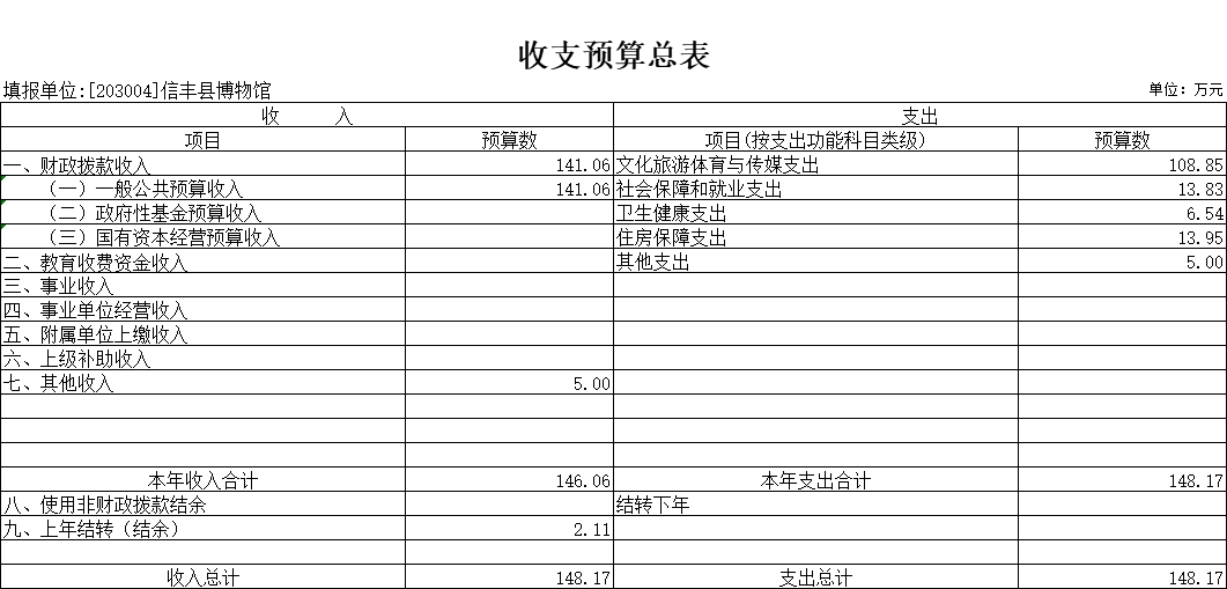 2025年博物馆收入预算总额为 148.17 万元,较上年预算安排减少 13.92 万元,其中:财政拨款收入 141.06 万元,较上年预算安排减少 11.03 万元;教育收费资金收入0 万元,较上年预算安排增加(减少) 0 万元;事业收入 0 万元,较上年预算安排增加(减少) 0 万元;事业单位经营收入 0 万元,较上年预算安排增加(减少) 0 万元;附属单位上缴收入 0 万元,较上年预算安排增加(减少)0 万元;上级补助收入 0 万元,较上年预算安排增加(减少) 0 万元;其他收入 5 万元,较上年预算安排减少 5 万元;使用非财政拨款结余 0 万元,较上年预算安排增加(减少) 0 万元;上年结转(结余) 2.11 万元,较上年预算安排增加 2.11 万元。