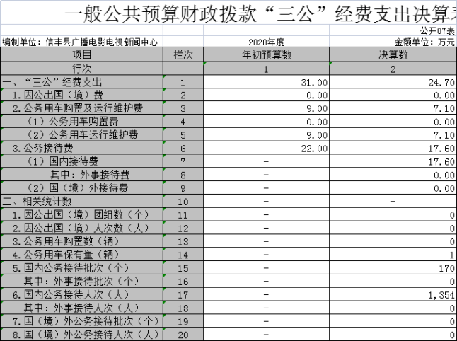 (二)公务接待费支出年初预算数为22万元,决算数为17.6万元,完成预算的80%,决算数较2019年减少4.9万元,下降20%,主要原因是压缩行政运行费用,践行勤俭节约。2020年度公务接待批次170次,接待人次1354次(个),主要为接待上级媒体及全县重大宣传活动支出。