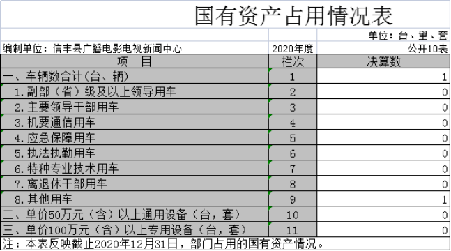 截止2020年12月31日,本部门(单位)国有资产占用情况见公开10表《国有资产占用情况表》。其中车辆中的其他用车主要是采访用车。