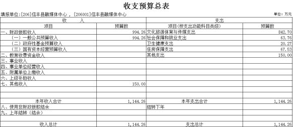 2023年信丰县融媒体中心收入预算总额为1144.26万元,较上年减少212.31万元。其中:财政拨款收入994.26万元,占收入预算总额的86.89%,较上年预算安排增加63.69万元,包括一般公共预算收入994.26万元,政府性基金预算收入0万元,国有资本经营预算收入0万元;教育收费资金收入0万元,占收入预算总额的0%,较上年预算安排增加(减少)0万元;事业收入0万元,占收入预算总额的0%,较上年预算安排减少40万元;其他收入150万元,占收入预算总额的13.1%,较上年预算安排减少236万元;上年结转(结余)0万元,较上年增加(减少)0万元。