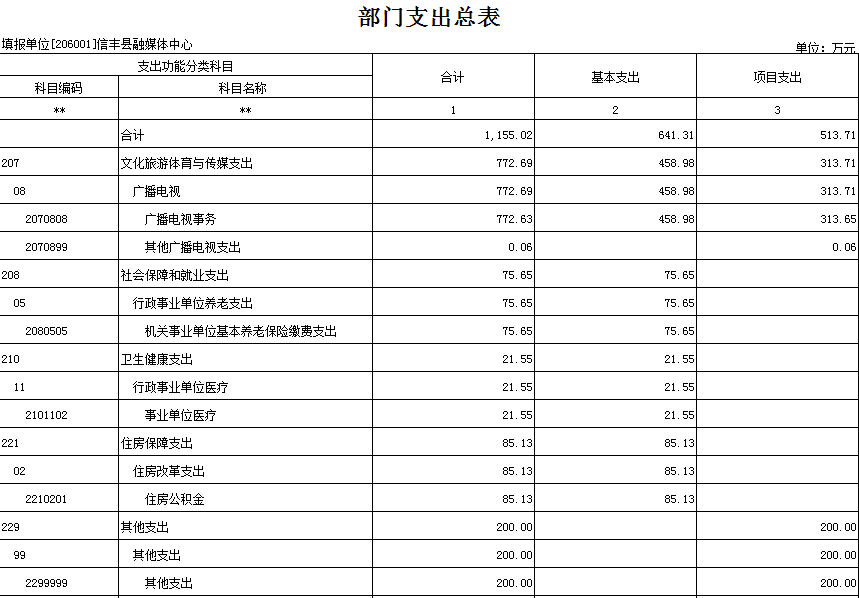 广播电视事务支出 772.69 万元,较上年预算安排减少 68.88 万元;社会保障和就业支出 75.65 万元,较上年预算安排增加 9.66 万元;卫生健康支出 21.55 万元,较上年预算安排减少 0.61 万元;住房保障支出 85.13 万元,较上年预算安排增加 28.35 万元;其他支出 200 万元,较上年预算安排减少 250 万元。