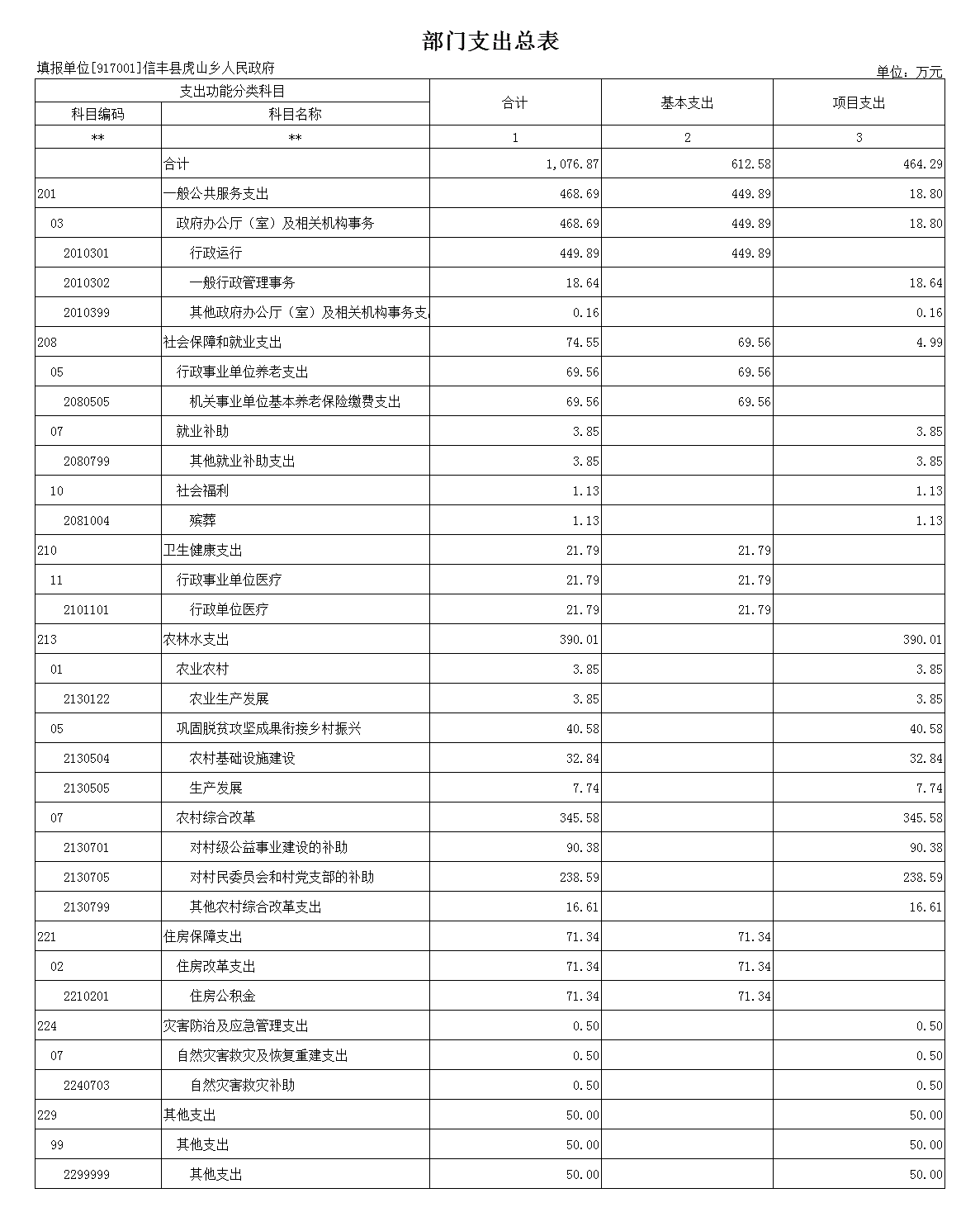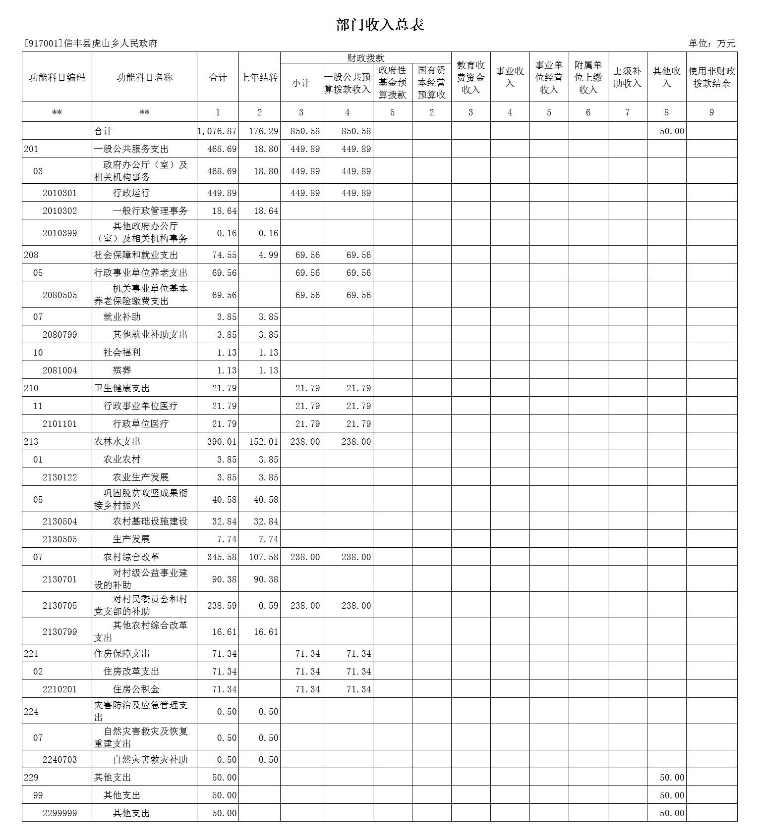 按支出功能科目划分:一般公共服务支出449.89万元,国防支出0万元,公共安全支出0万元,教育支出0万元,科学技术支出0万元,文化旅游体育与传媒支出0万元,社会保障和就业支出69.56万元,卫生健康支出21.79万元,节能环保支出0万元,城乡社区支出0万元,农林水支出238万元,交通运输支出0万元,资源勘探工业信息等支出0万元,商业服务业等支出0万元,金融支出0万元,自然资源海洋气象等支出0万元,住房保障支出71.34万元,粮油物资储备支出0万元,灾害防治及应急管理支出0万元,其他支出0万元。