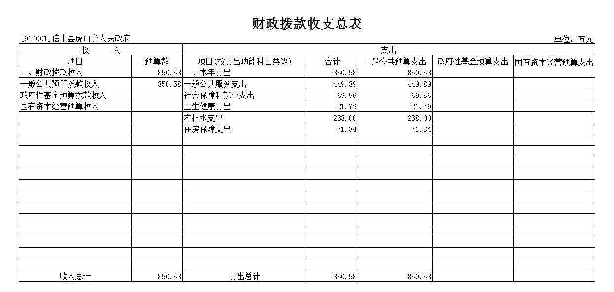 2025年信丰县虎山乡人民政府部门财政拨款支出预算总额850.58万元,较上年预算安排减少201.46万元;
