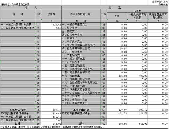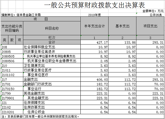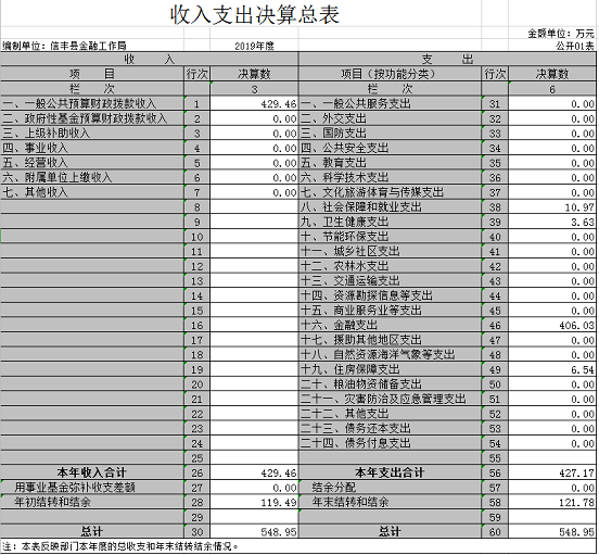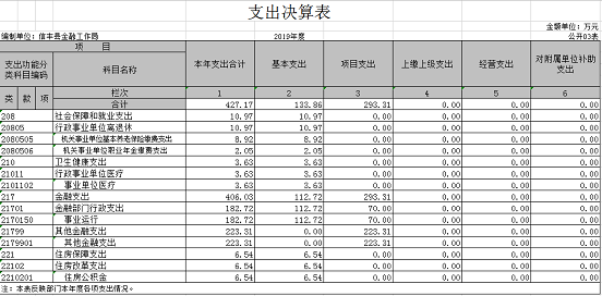 本部门2019年度支出总计548.95万元,其中本年支出合计427.17万元,较2018年减少45.3万元,增长(下降)9.59%,主要原因是:厉行节约压减预算,且金融机构考核奖励较去年有所减少;年末结转和结余121.78万元,较2018年增加2.29万元,增长1.92%,主要原因是:部分金融机构考核奖励未及时划走。