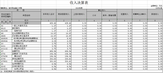 本部门2019年度收入总计548.95万元,其中年初结转和结余119.49万元,较2018年减少43万元,下降7.26%;本年收入合计429.46万元,较2018年减少31.64万元,下降6.86%,主要原因是:厉行节约压减支出,且金融机构考核奖励较去年有所减少。