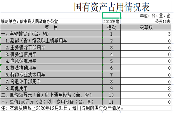 截止2020年12月31日,本部门(单位)国有资产占用情况见公开10表《国有资产占用情况表》。其中车辆中的其他用车主要是一台主要领导用车帕萨特轿车、一台机要通信用车帕萨特轿车、一台红旗牌应急保障用车。