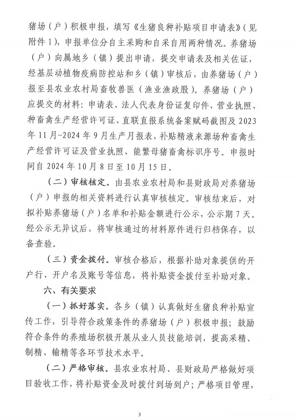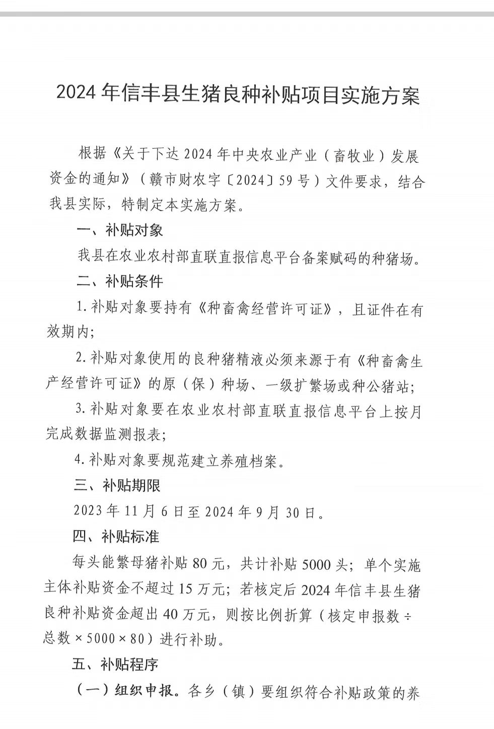 根据《关于下达2024年中央农业产业(畜牧业)发展资金的通知》(赣市财农字〔2024〕59号)文件要求,结合我县实际,特制定本实施方案。现将《2024年信丰县生猪良种补贴项目实施方案》印发给你们,请结合实际,认真抓好贯彻落实。