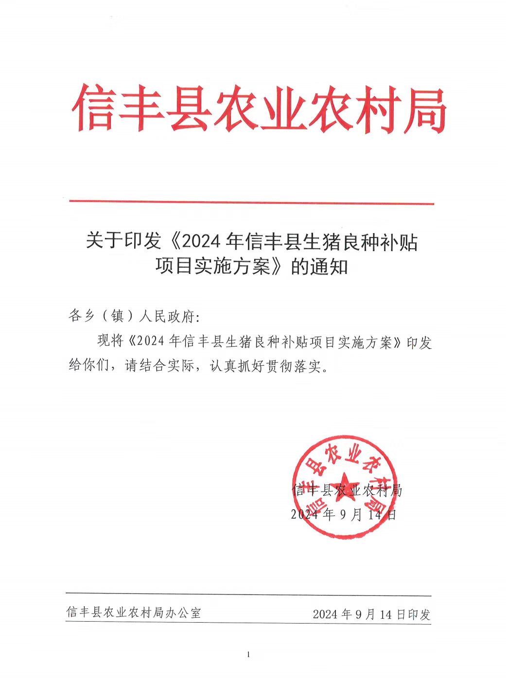 关于印发《2024年信丰县生猪良种补贴项目实施方案》的通知