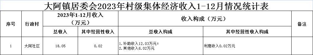 大阿镇居委会2023年村级集体经济收入1-12月情况统计表