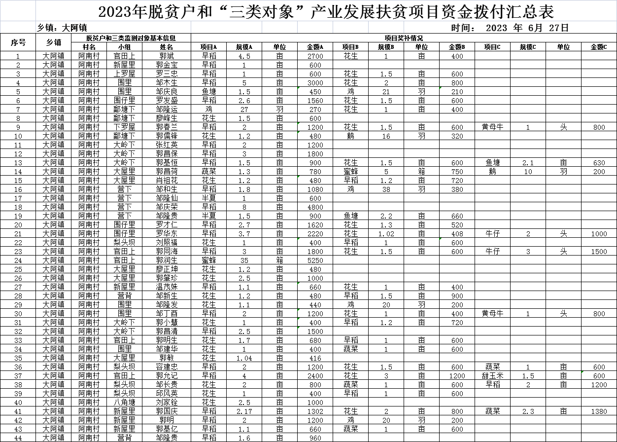 大阿镇阿南村2023年脱贫户和“三类对象”产业发展扶贫项目资金拨付汇总表