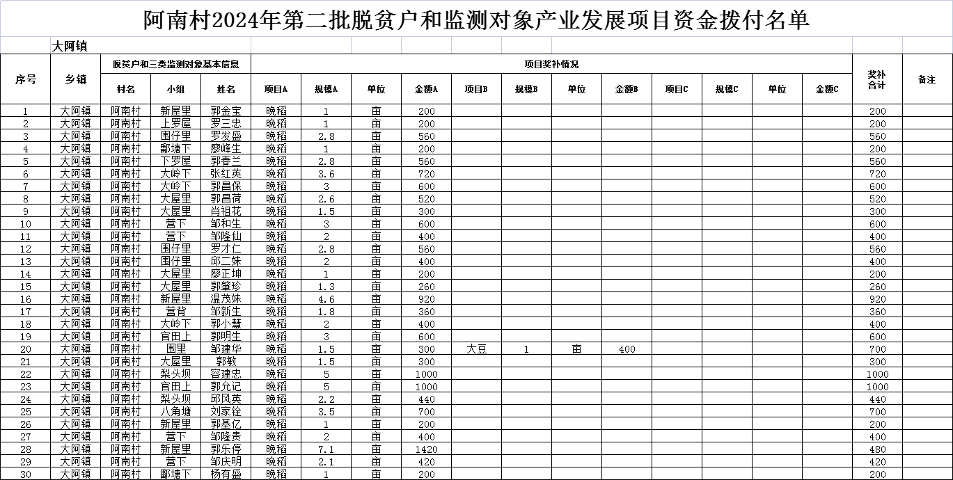 阿南村2024年第二批脱贫户和监测对象产业发展项目资金拨付名单
