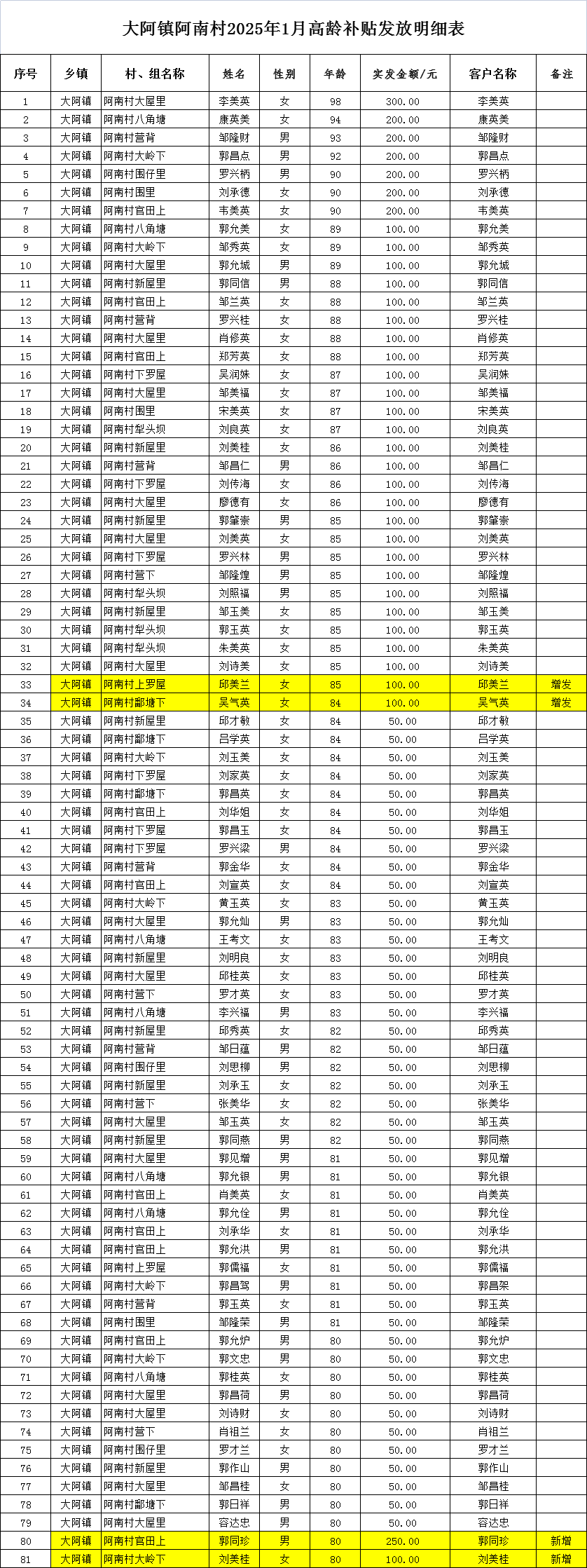 大阿镇阿南村2025年1月高龄补贴发放明细表