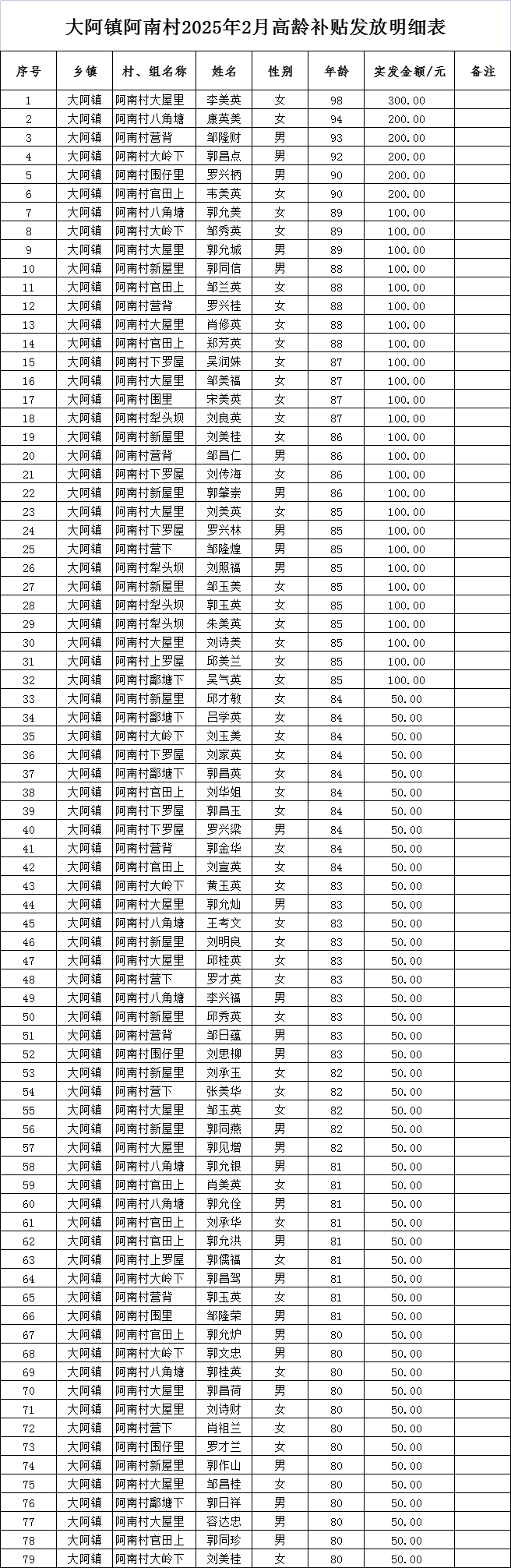 大阿镇阿南村2025年2月高龄补贴发放明细表