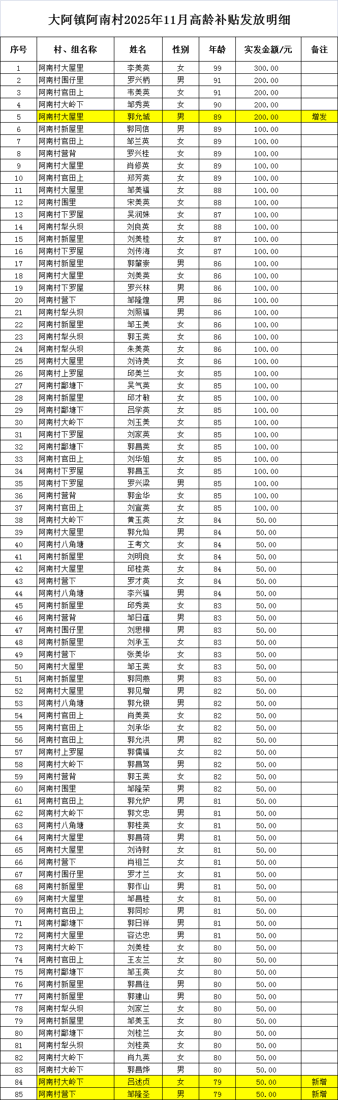 大阿镇阿南村2025年11月高龄补贴发放明细