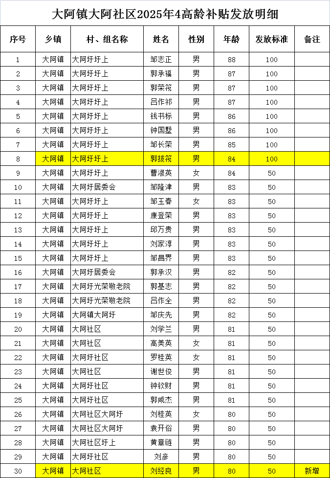 大阿镇大阿社区2025年4月高龄补贴发放明细