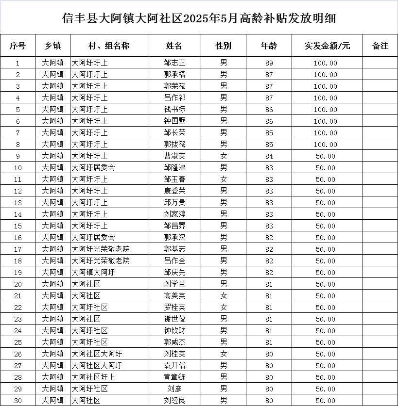 大阿镇大阿社区2025年5月高龄补贴发放明细