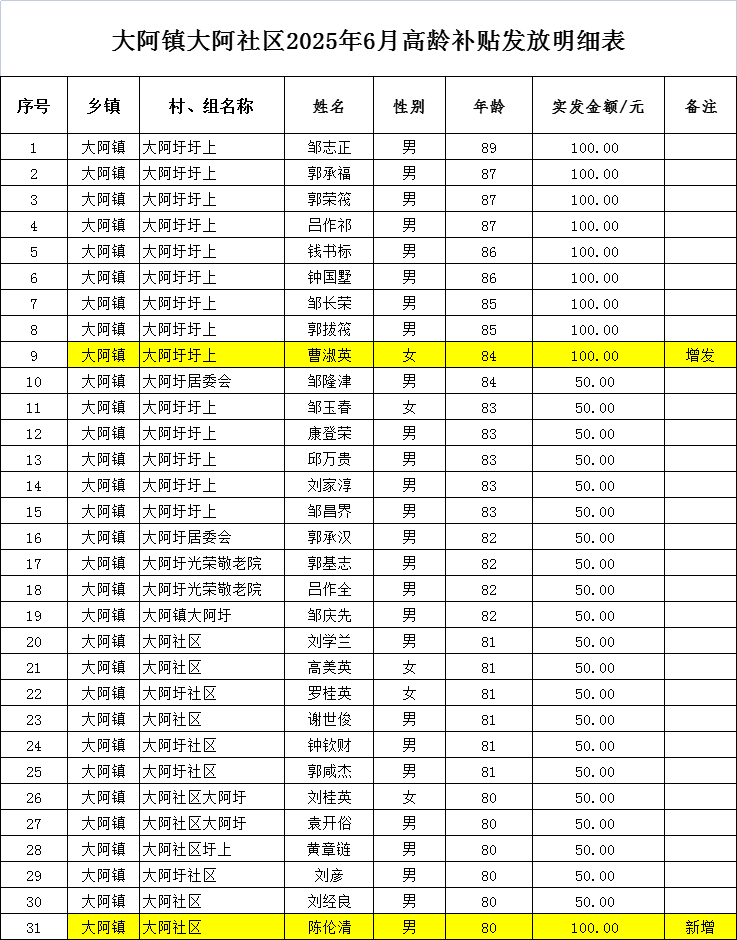 大阿镇大阿社区2025年6月高龄补贴发放明细表
