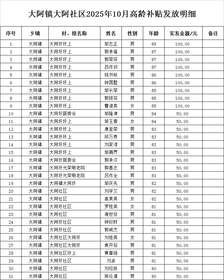 大阿镇大阿社区2025年10月高龄补贴发放明细