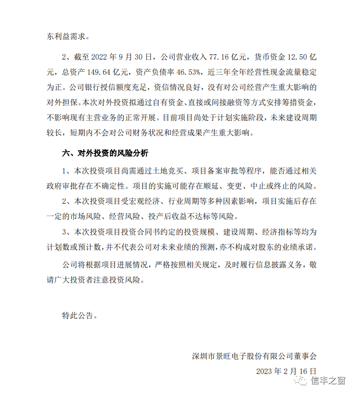 据了解,景旺电子是中国电子电路行业的领军企业,2021年度中国综合PCB百强排行榜景旺电子位列第七,在内资企业中排名行业第三,是全球产品线最齐全、产品最丰富的电子电路制造企业。包括信丰项目,在国内布局六个生产基地。2022年实现营业收入突破百亿元,逆势实现双指标、两位数增长。景旺电子新建高多层PCB智能制造基地项目,分两期建设,预计总投资约30亿元,其中固定资产投资预计约20亿元以上。引进先进工艺技术、智能化、高精密制造设备,打造一个自动化、智能化程度最高、生产效率最高、成本优势最突出的高多层PCB研发生产基地。