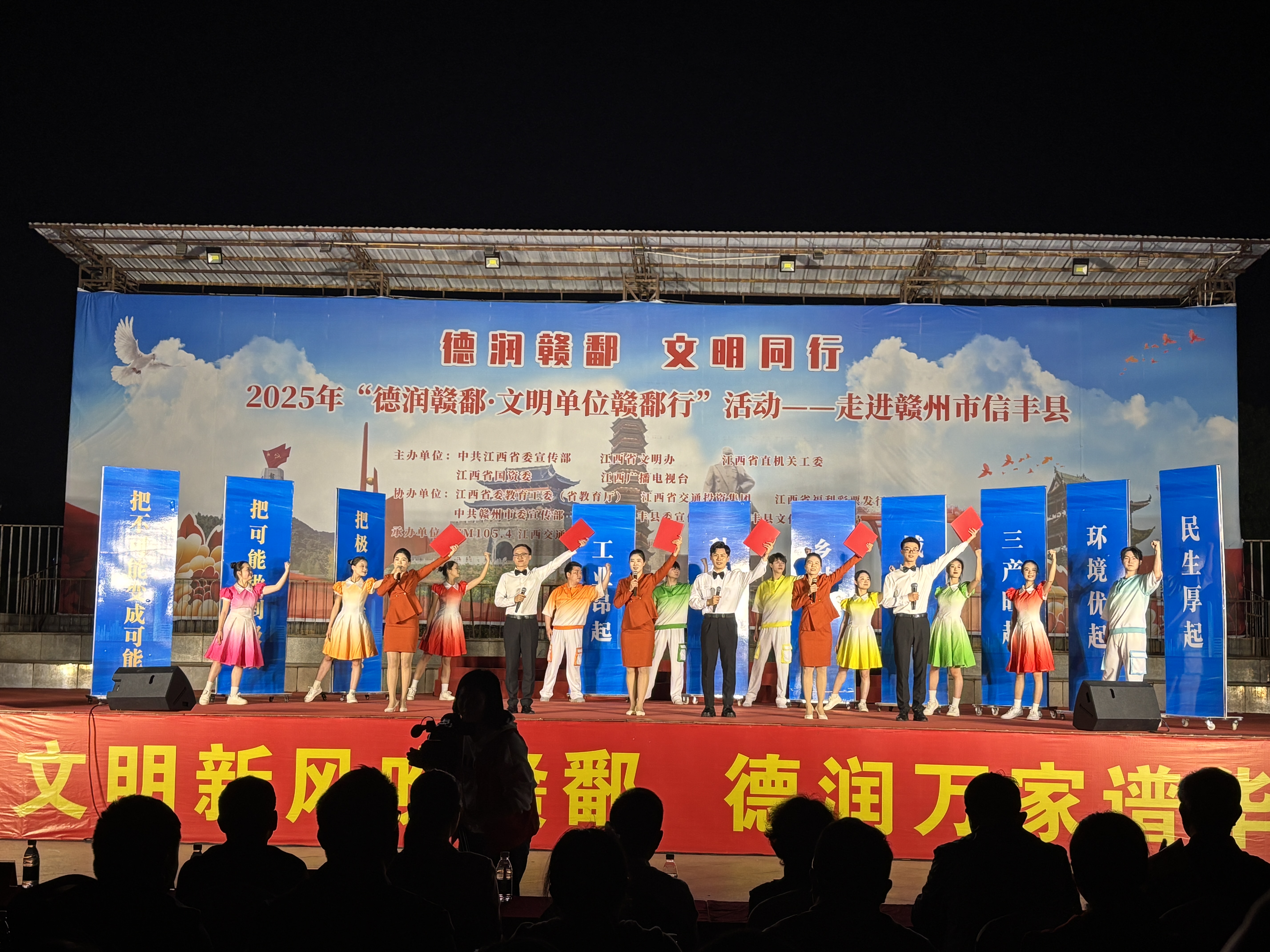 3月24日晚7点,由中共江西省委宣传部、江西省文明办、江西省直机关工委、江西省国资委及江西广播电视台联合主办的2025年“德润赣鄱·文明单位赣鄱行”大型活动,在信丰县陈毅广场盛大举行。这场文明与艺术的盛宴以多样化的形式为群众送去了文明新风、贴心服务、精彩文艺和身边榜样。