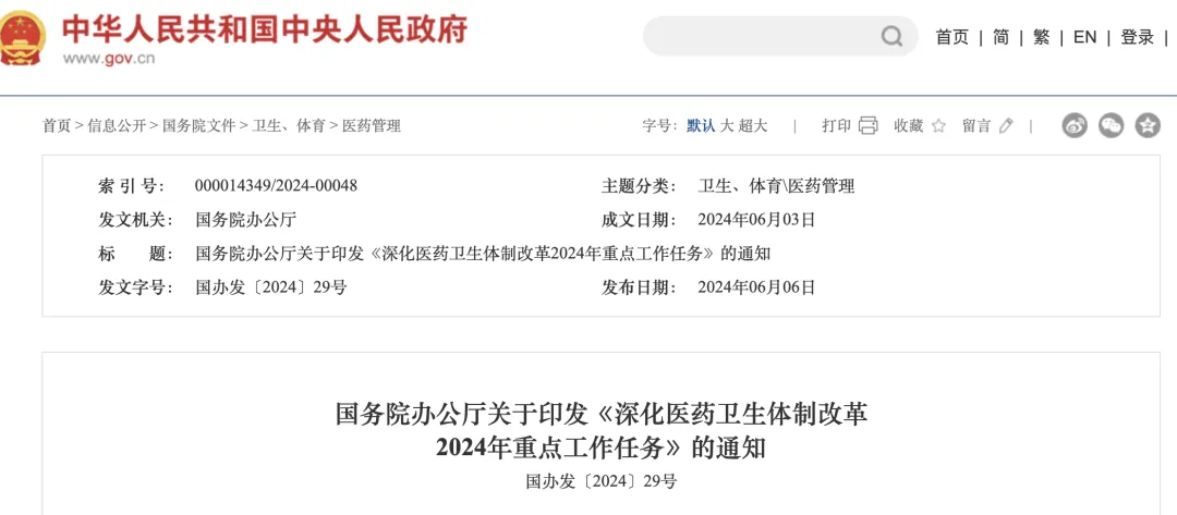 6月6日,国务院办公厅发布关于印发《深化医药卫生体制改革2024年重点工作任务》的通知,旨在聚焦医保、医疗、医药协同发展和治理,推动卫生健康事业高质量发展,提高人民群众获得感幸福感安全感。