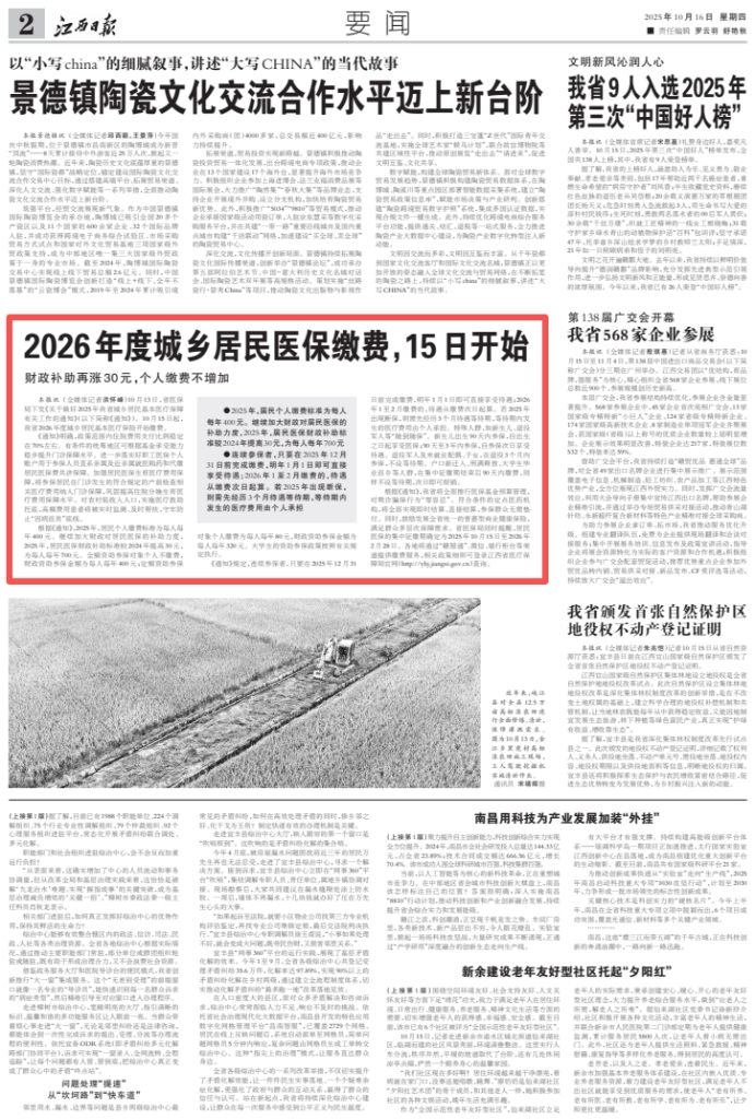根据《通知》,我省将全面推行医保基金预算管理,对欺诈骗保行为“零容忍”。符合条件的定点医药机构,将全面实现即时结算、直接结算,参保群众无需垫付。同时,鼓励发展全省统一的普惠型商业健康保险,满足群众多层次保障需求。省医保局同时提醒,居民医保的集中征缴期确定为2025年10月15日至2026年2月28日。各地将通过“赣服通”、微信、银行柜台等渠道提供缴费服务,相关政策细则可登录江西省医疗保障局官网(http://ybj.jiangxi.gov.cn)查询。