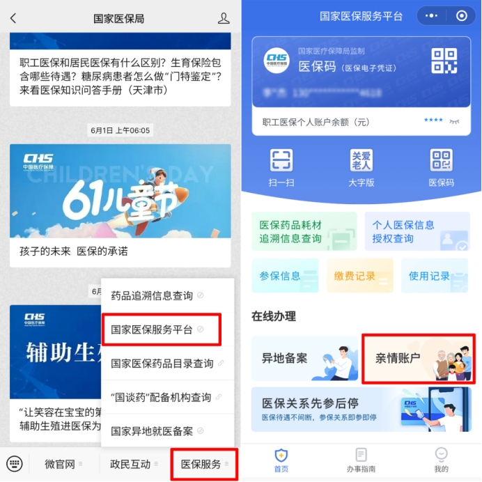 点击医保服务→国家医保服务平台,进入“亲情账户”操作页面