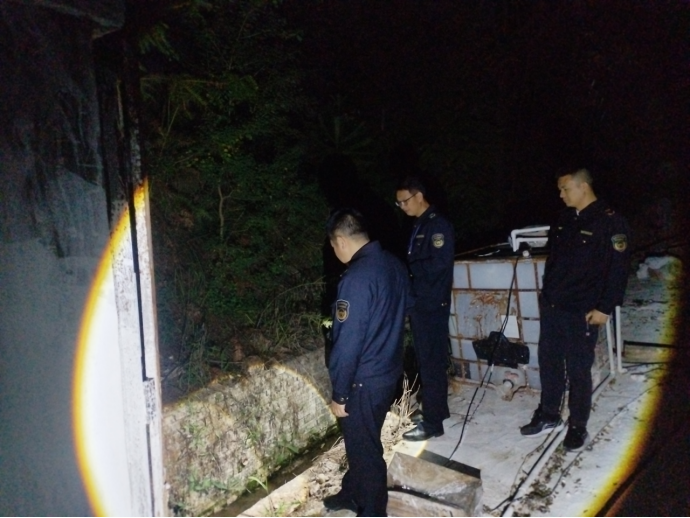 日,唐惠星大队长带队对东河沿线古陂镇太平养殖小区畜禽养殖企业和大唐工业园进行夜查。