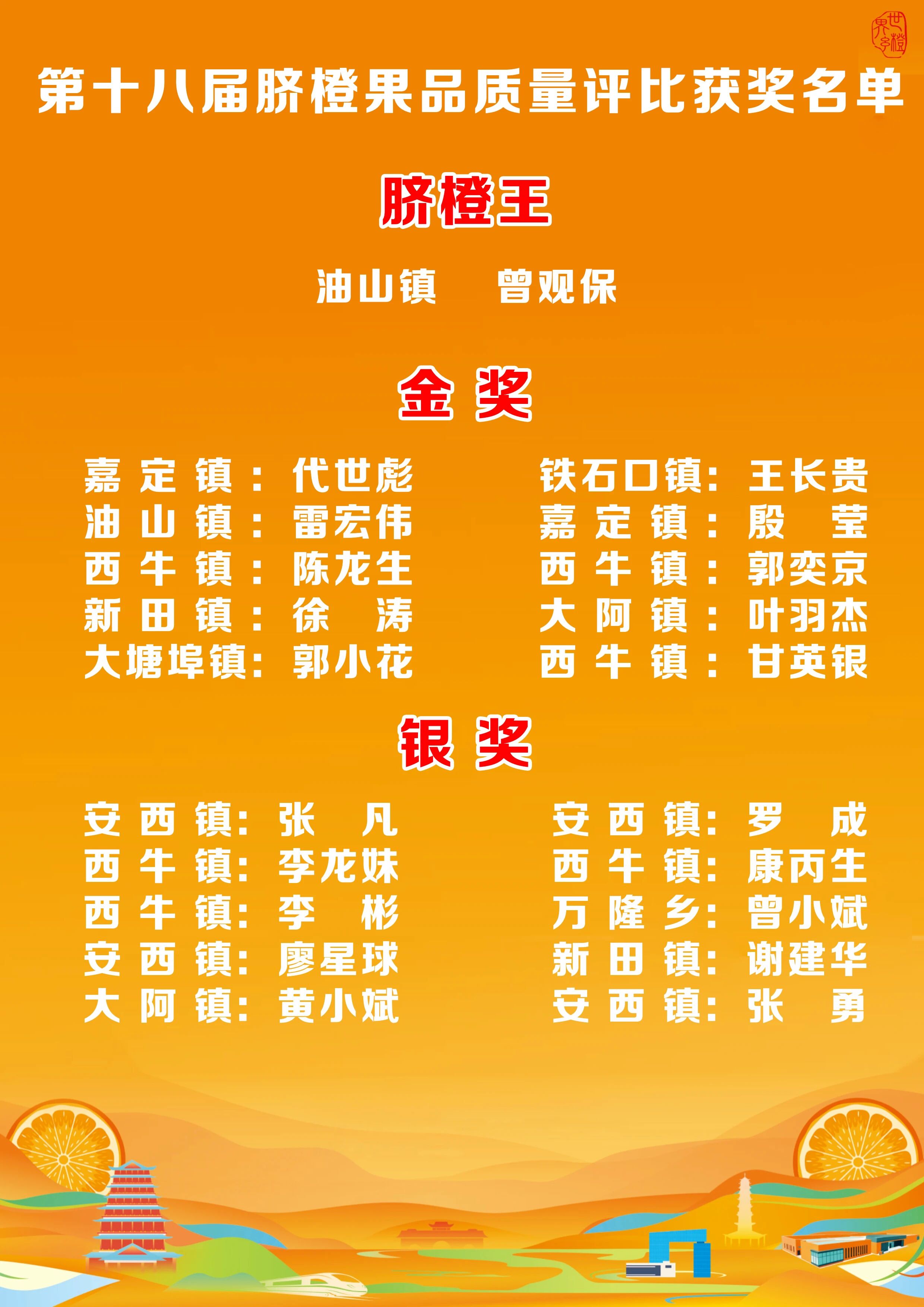 最终,来自油山镇新水塘村曾观保的7号果品,以94.02分的优异成绩,摘得 2025年“脐橙王”的桂冠。2025年度脐橙金奖和脐橙银奖也各诞生了十名。