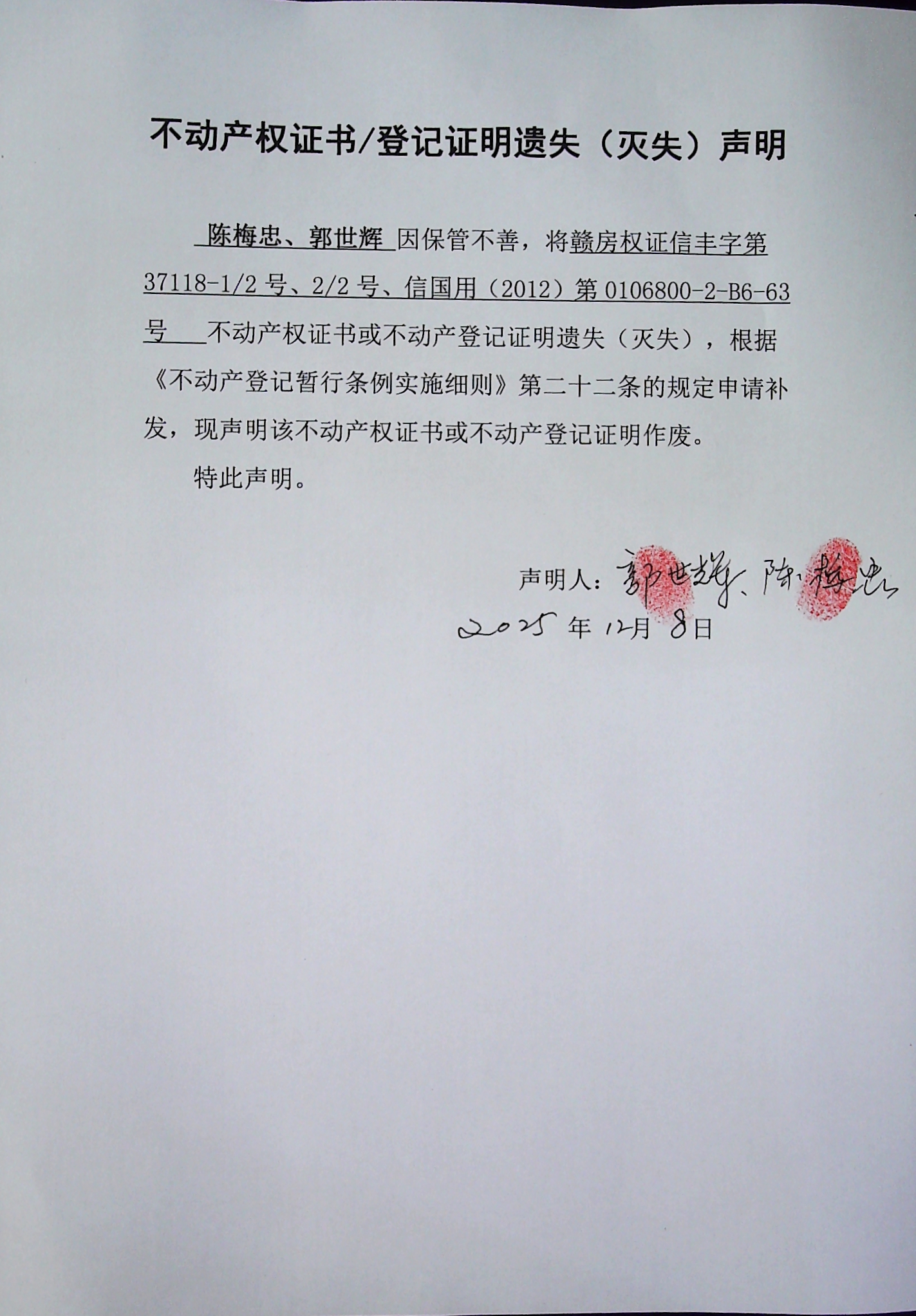 陈梅忠、郭世辉不动产权证书遗失(灭失)声明