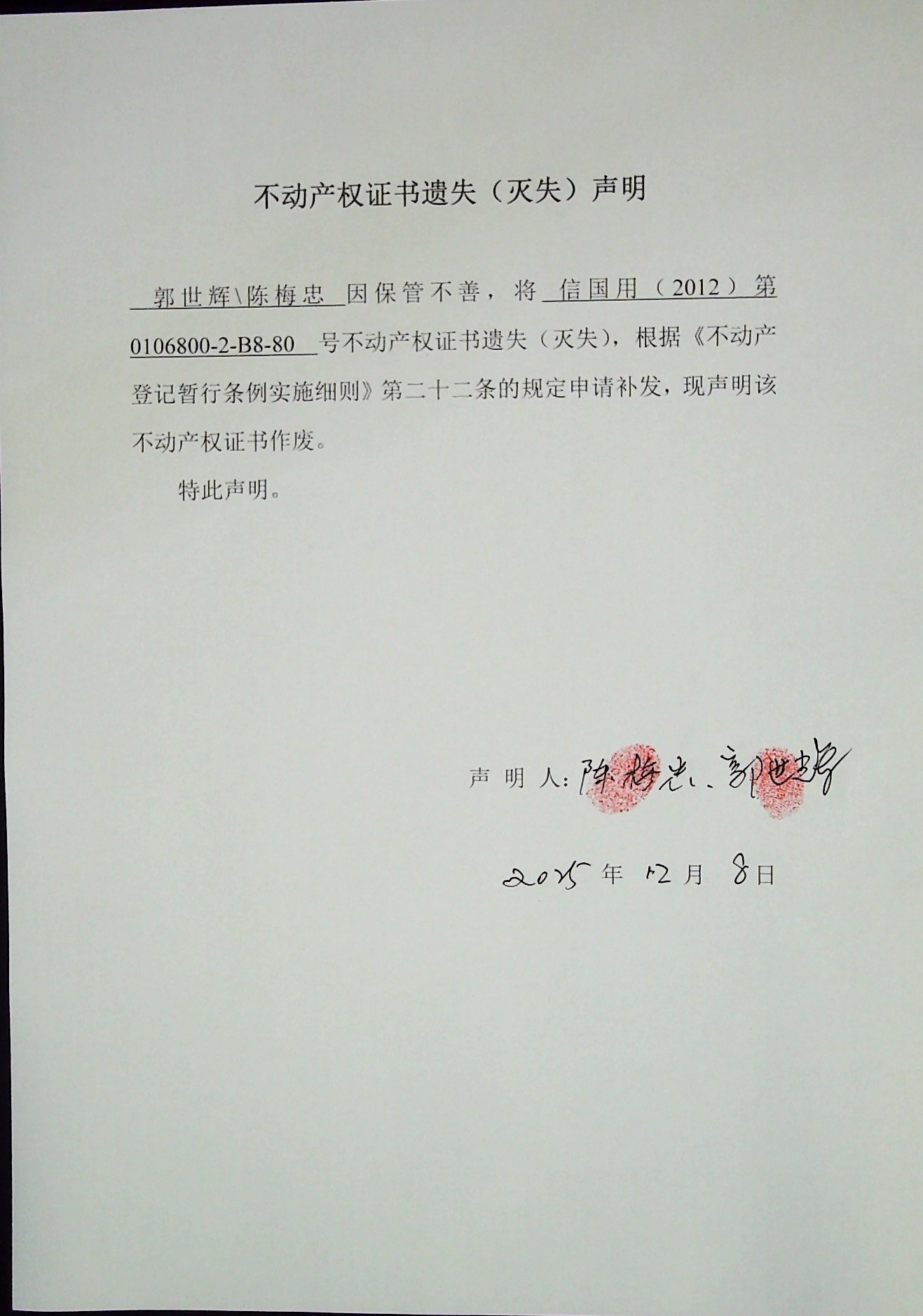 郭世辉、陈梅忠土地使用权证遗失(灭失)声明