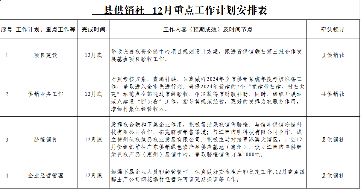 县供销社12月重点工作计划安排表