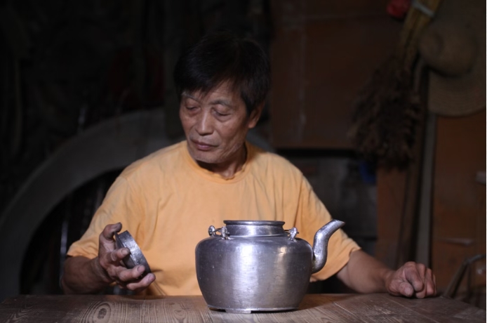 作为市级非遗项目,信丰小河客家锡壶制作工艺是广泛流传和盛行于赣南客家民间的金属工艺。以纯锡为料,借其“熔点低、延展性强”特性,“盛水水清甜,盛酒酒香醇”的独特价值,既是客家人日常用器,更在婚嫁、祭祀等重要场合承载文化意义。制作流程主要有熔化、压片、铸模、裁料、造型、锻打、焊接、挫刮、抛光、雕刻等十多道工序,其中锻打和焊接是制作锡壶最为关键的工序,因为不是用统一的模具铸造,所以每把壶都有其独特的神态,且严守“三年徒弟二年半作”传承规训,慢工出细活的坚守让锡壶可历经百年不变形,成为家族“传家宝”。
