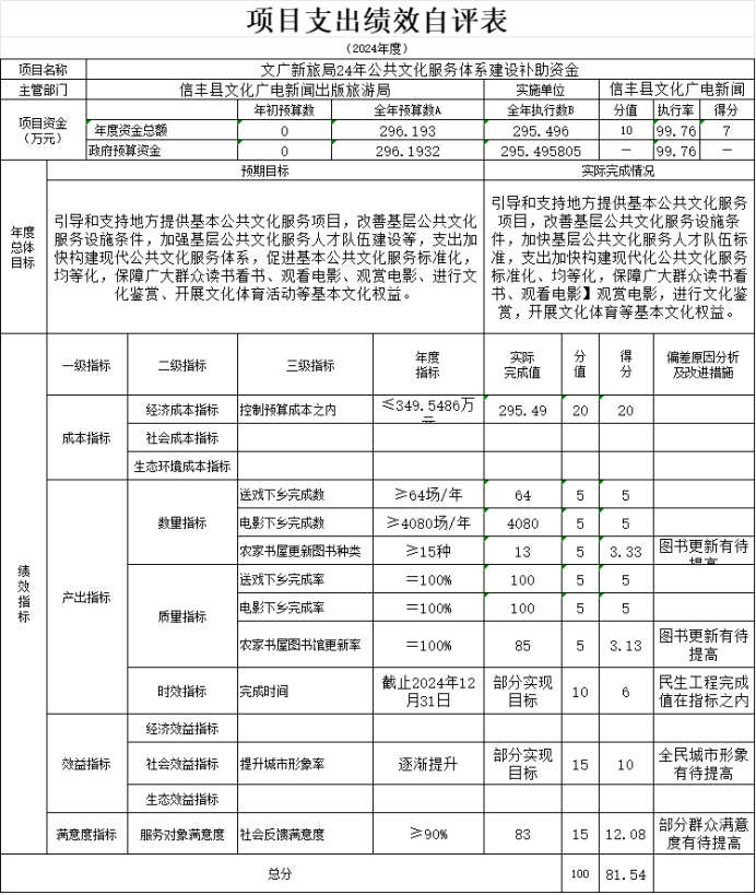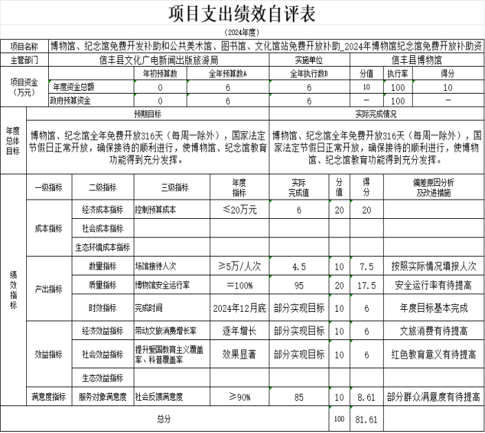 本部门“ 文广旅局24年公共文化服务建设补助资金”“博物馆、纪念馆免免费开放补助资金” 项目支出绩效自评结果如下: