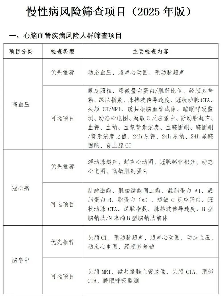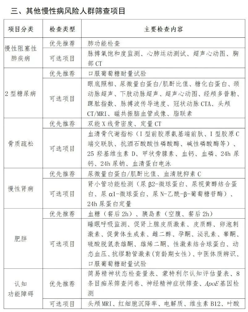 在基本体检项目的基础上,结合健康体检自测问卷,对存在心脑血管疾病、常见恶性肿瘤、慢性呼吸系统疾病、糖尿病等疾病风险的人群,根据慢性病筛查与早诊早治方案等增加个性化深度检查项目。