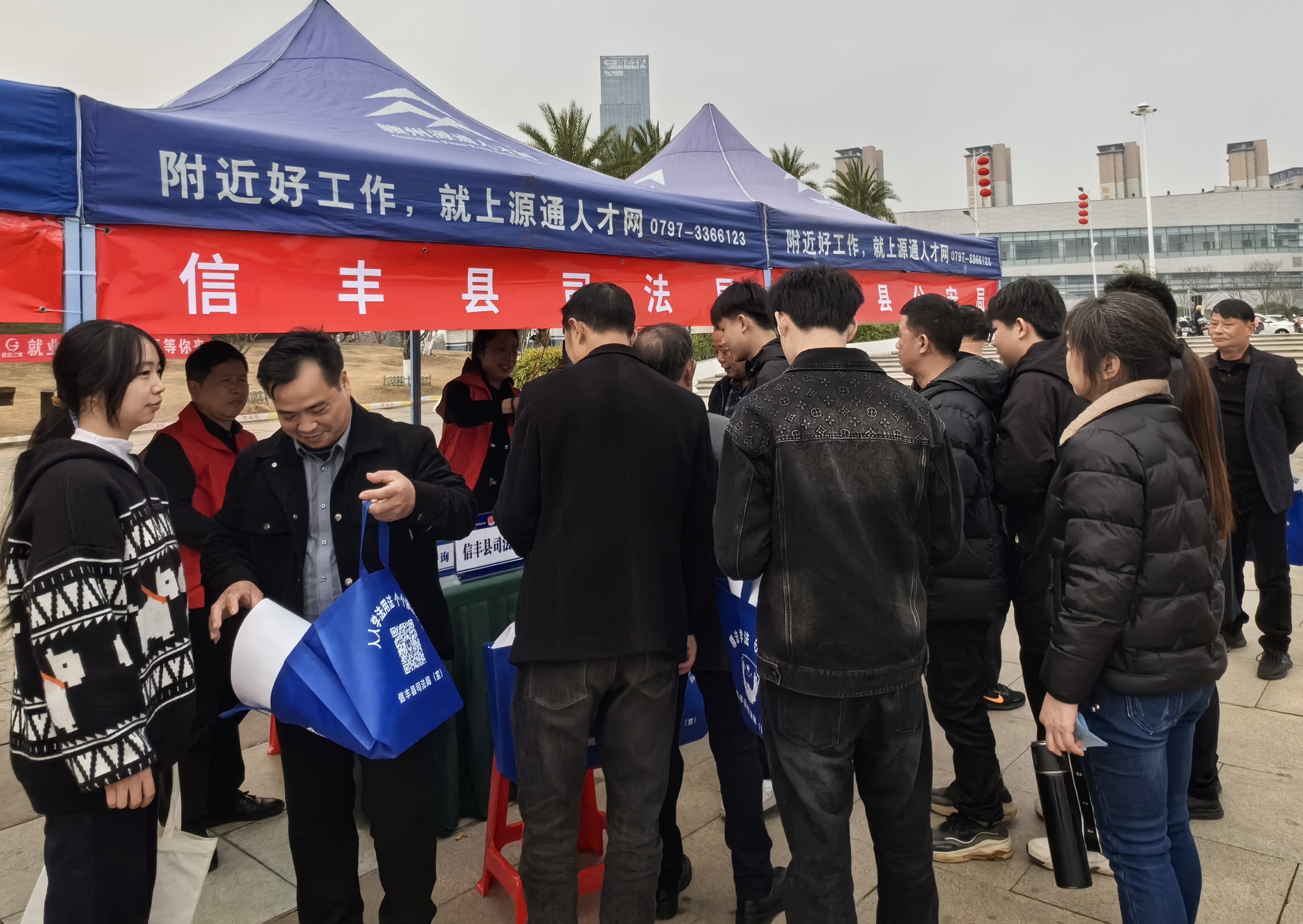 1月25日至27日,在信丰县2025年“就业580”暨就业援助月专场招聘会召开之际,县司法局组织司法行政干部、律师、普法志愿者、"法律明白人”骨干在花园湾广场积极开展普法宣传活动,将法治春风送进招聘会现场,为广大群众提供免费法律服务、法律咨询,共发放宪法、民法典进企业、法治年画、法律明白人、法律援助法等相关普法宣传资料3200余份,解答群众法律咨询180余人次,免费为群众送上新春法治礼包。不仅帮助务工人员在求职过程中规避风险,提高依法维护自身合法权益的意识和能力,而且增强了用人单位依法用工、守法经营的意识,为企业生产经营营造了良好的法治氛围。