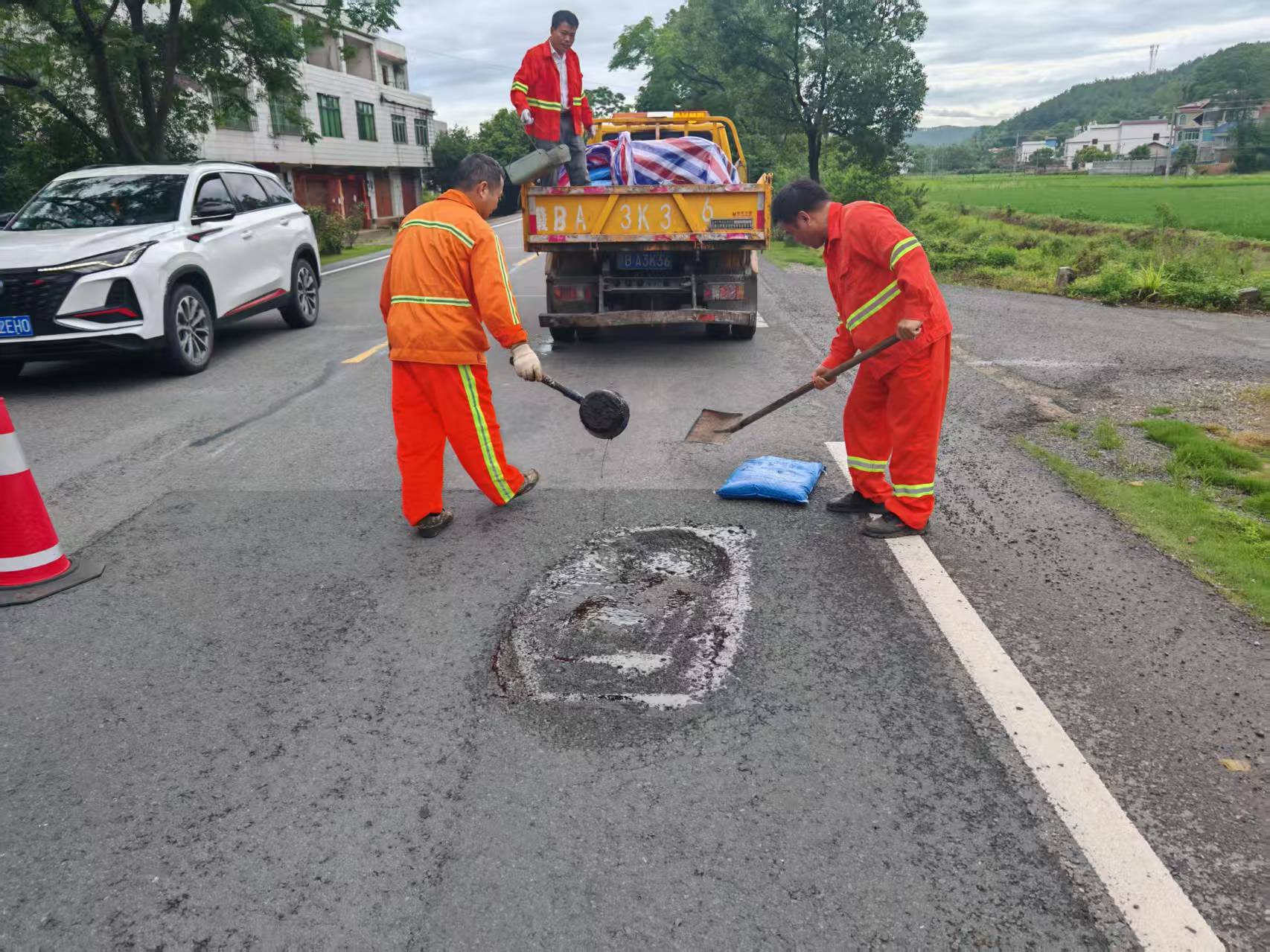 2025年6月17日,信丰公路分中心新田道班养护人员修补路面坑槽