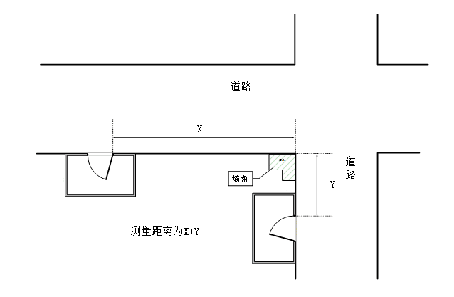 (四)申请点与参照点位于道路转角的,沿转角测量行人可无障碍通行且符合日常生活逻辑的最短距离(图5)。